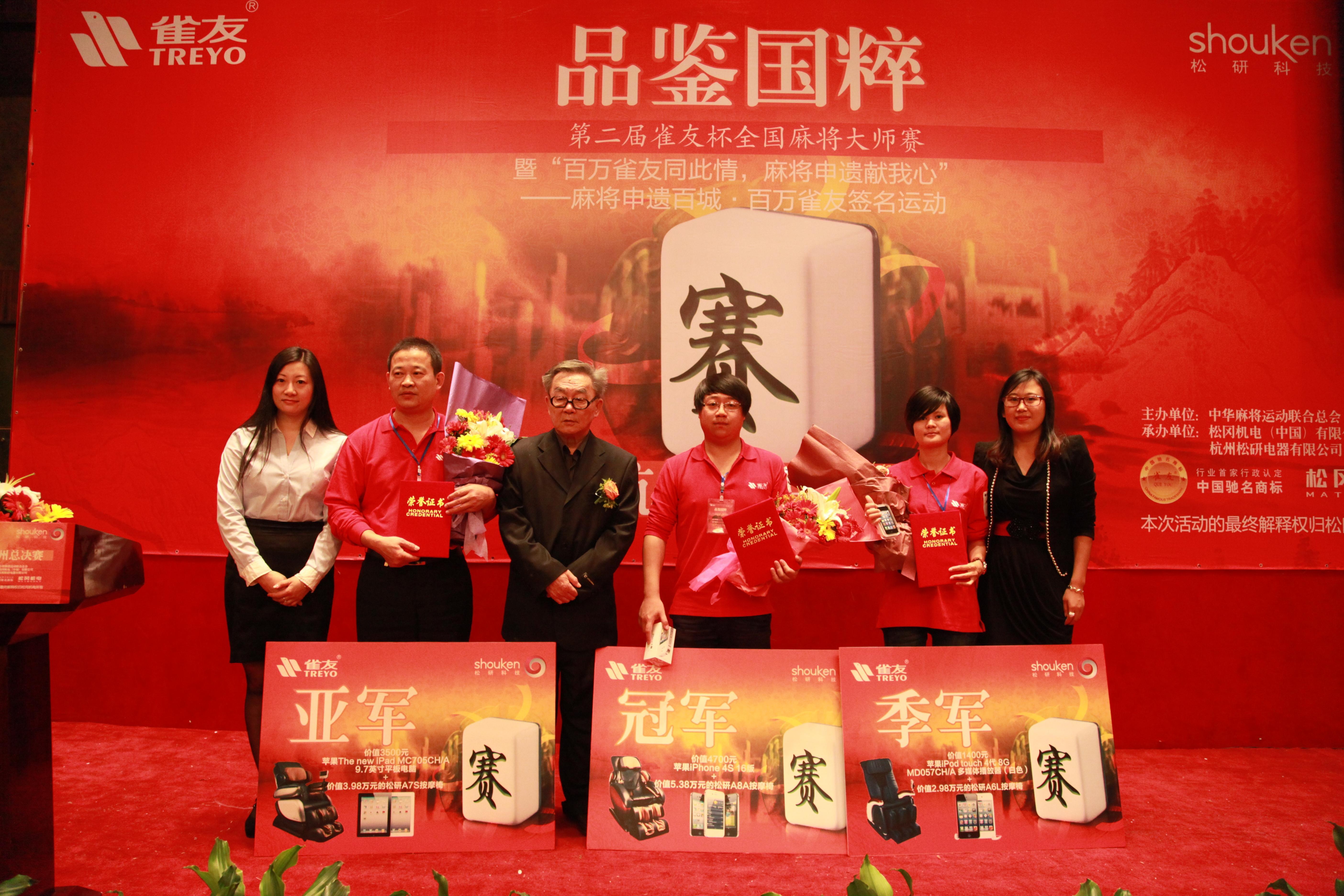 杭州2012年10月29日電 /美通社/ -- 10月27日,品鑒國粹第二屆雀友杯全國麻將大師賽總決賽在杭州眾安假日酒店圓滿落幕。中華麻將運動聯(lián)合總會會長盛琦,松岡機電(中國)有限公司董事長魏國華、常務副總經(jīng)理鄭忠良、營銷中心副總經(jīng)理何亦男、營運中心副總經(jīng)理潘林、營運中心總監(jiān)傅亦明以及杭州松研電器有限公司大客戶總監(jiān)于雪梅等攜42位來自全國21個分賽區(qū)的冠亞軍麻將大師出席大賽。本屆賽事仍由中華麻將運動聯(lián)合總會主辦,由目前全球較大的自動麻將機生產(chǎn)基地之 -- 松岡機電(中國)有限公司承辦,并獲得按摩椅產(chǎn)業(yè)領先者杭州松研電器有限公司的全程贊助。