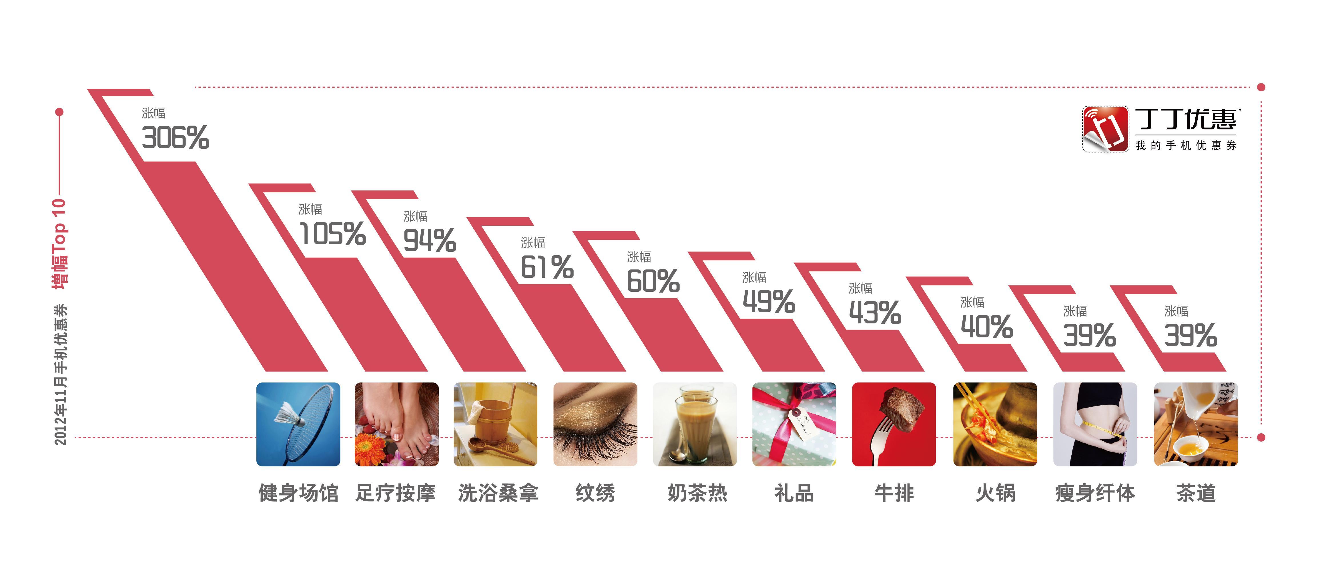 上海2012年12月13日電 /美通社/ -- 今日,國內(nèi)較大的手機(jī)優(yōu)惠券 APP -- 丁丁優(yōu)惠發(fā)布2012年11月份手機(jī)優(yōu)惠券指數(shù)。數(shù)據(jù)顯示,進(jìn)入冬季,天氣因素在很大程度上決定了人們的消費(fèi)行為,加之11月份鮮有大節(jié)日,用戶的消費(fèi)趨勢更顯時(shí)令性,取“暖”消費(fèi)是本季生活類消費(fèi)大趨勢。其中室內(nèi)健身場館搜索量高增306%成為亮點(diǎn)。