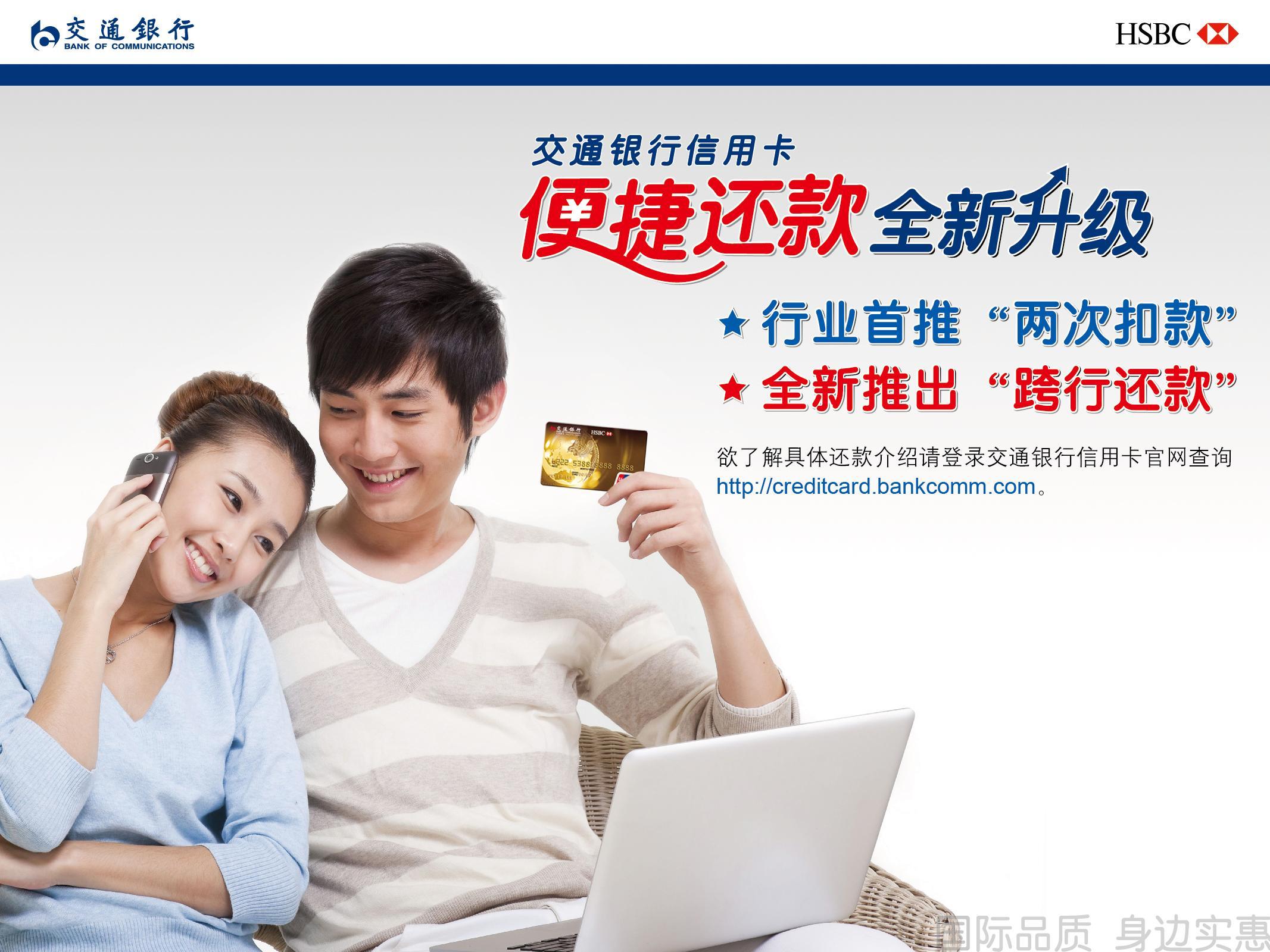 上海2012年12月24日電 /美通社/ -- 服務(wù)無止境,體驗無上限,交通銀行信用卡一直致力于為持卡人提供便利、快捷的還款服務(wù)。最近,交通銀行信用卡在業(yè)內(nèi)首創(chuàng)信用卡還款“兩次扣款”功能,并為持卡人提供跨行還款服務(wù),還款服務(wù)全面升級,讓持卡人還款更便利、更快捷、更省心。