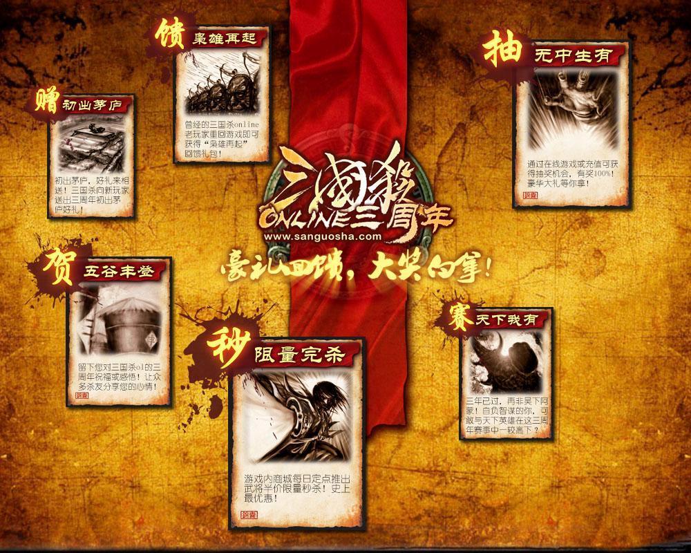 北京2012年12月27日電 /美通社/ -- 2012年12月25日,《三國(guó)殺OL》三周年慶典活動(dòng)正式拉開帷幕,新老玩家再次匯聚一堂,歡度這個(gè)屬于所有“殺友”的節(jié)日。為此,官方準(zhǔn)備了尊貴的專屬禮包,以及六大活動(dòng),百萬豪禮回饋新老玩家。不僅有游戲道具、精美三國(guó)秀、限量武將相贈(zèng),更有《三國(guó)殺》實(shí)體牌、手機(jī)、平板電腦等實(shí)物大獎(jiǎng)供玩家贏取。