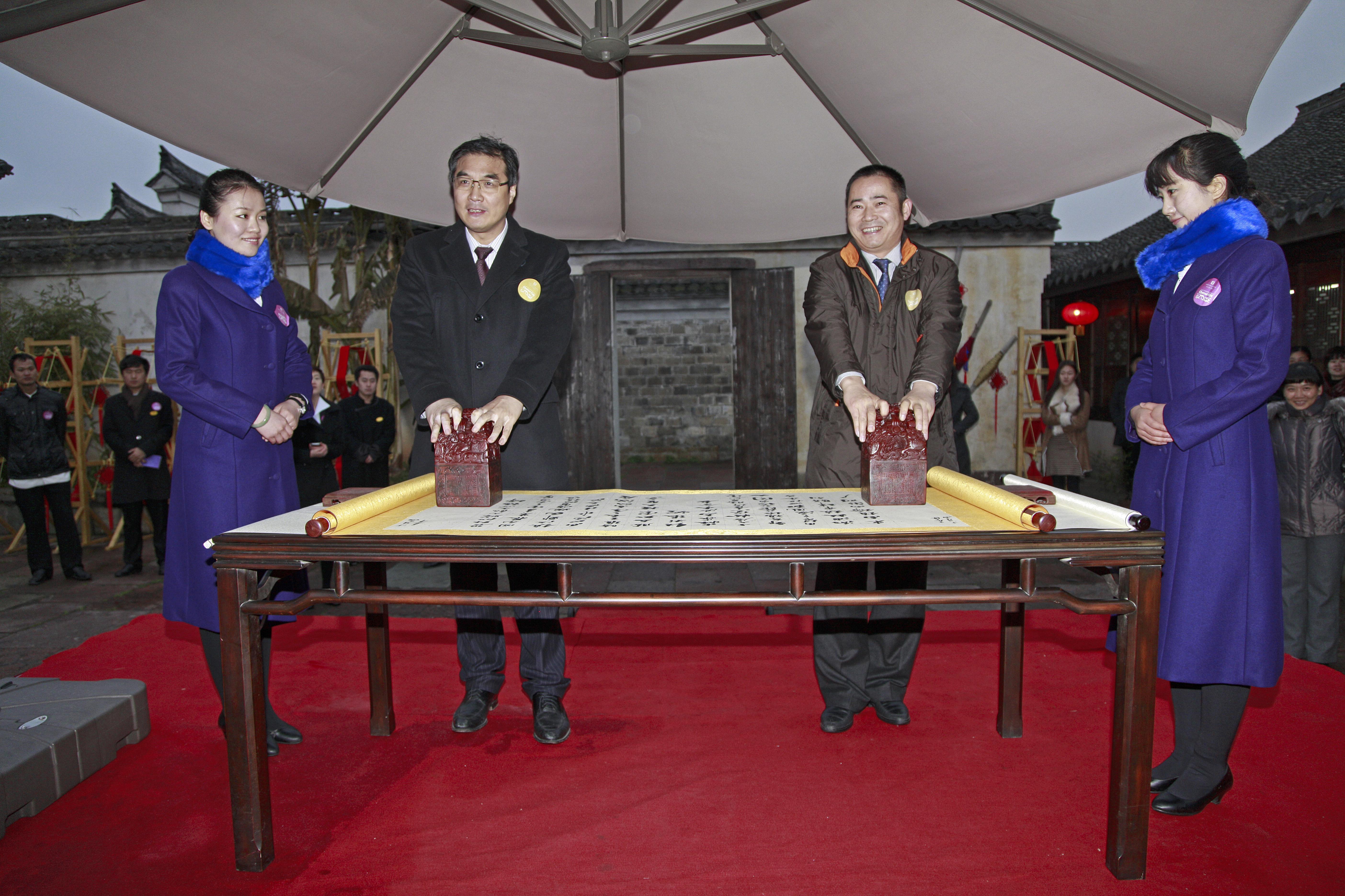 鎮(zhèn)海區(qū)副區(qū)長(zhǎng)王兆波和開(kāi)元旅業(yè)集團(tuán)總裁陳燦榮分別代表各方在現(xiàn)場(chǎng)簽了約。最后,鎮(zhèn)海區(qū)委書(shū)記薛維海和開(kāi)元旅業(yè)集團(tuán)董事長(zhǎng)陳妙林一起走上龍鳳臺(tái),為掛在臺(tái)梁柱上的大紅綢結(jié)彩,寓示兩家成功“聯(lián)姻”。