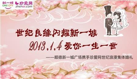 廣州2012年12月31日電 /美通社/ -- 在百年難得一遇的幸福起點,擁有真愛恒久流傳的浪漫回憶,是單身男女都期盼著的幸福人生。2013年1月4日,順德新一城攜手中國較大的相親網(wǎng)站珍愛網(wǎng) (zhenai.com) 在佛山順德新一城廣場舉辦的“世紀(jì)良緣閃耀新一城,2013.1.4愛你一生一世”世紀(jì)浪漫集體婚禮即將濃情啟幕,為新人締造一場甜蜜浪漫的世紀(jì)回憶。