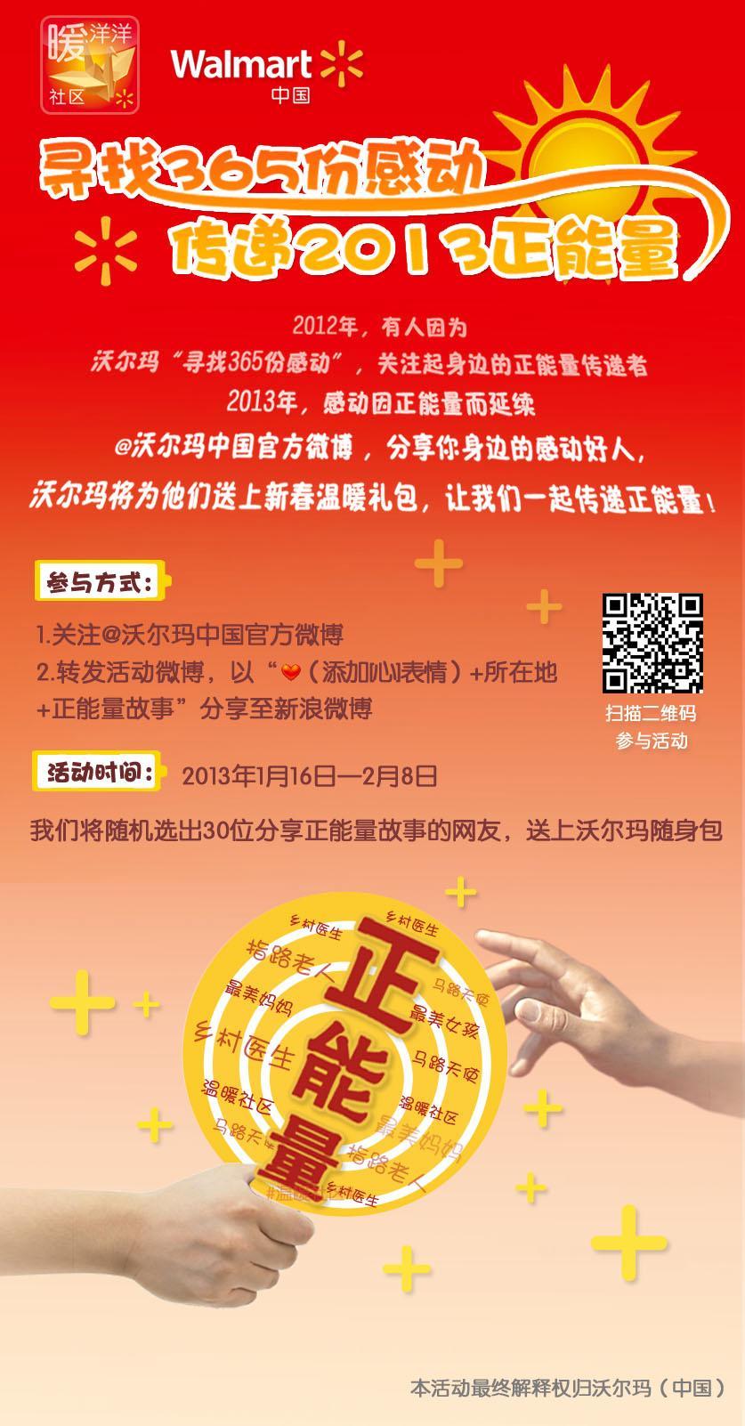 “尋找365份感動”微公益活動是沃爾瑪中國的品牌春節(jié)公益項目,自2011年起,將在每年的春節(jié)期間推出?;顒訉⒀埓蠹谊P注“@沃爾瑪中國官方微博”,轉(zhuǎn)發(fā)活動主貼,并將“正能量”故事分享至新浪微博(活動第一階段日期:即日起至2月8日)。沃爾瑪為正能量故事的主人公們精心準備了新春禮包,并將隨機選出30位分享正能量故事的網(wǎng)友(網(wǎng)友名單將在春節(jié)后發(fā)布),送上沃爾瑪隨身包。此外,“@沃爾瑪中國官方微博”還將定期發(fā)布員工志愿者組織的愛心活動,邀請大家報名參與。