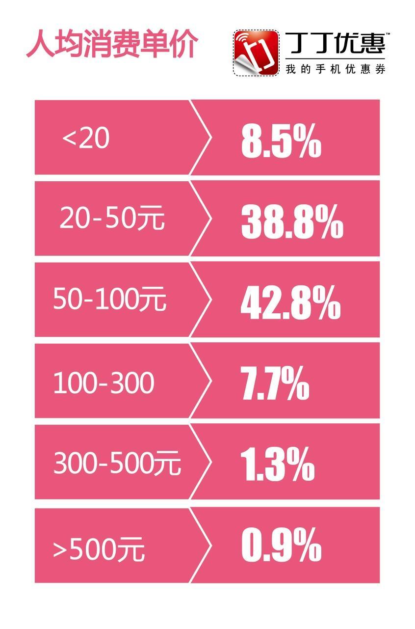另外,該類型商戶人均消費(fèi)水平以“50-100元”的范圍摘取頭魁,占比達(dá)到42.8%;而20-50元的人均單次消費(fèi)水平也很受歡迎,數(shù)值幾乎追平頭魁,達(dá)到38.8%。目前全國(guó)白領(lǐng)人均收入水平雖因城市差異,有小幅度差距,卻依然保持在3000左右小幅度振蕩,這個(gè)數(shù)值印證了人均餐飲消費(fèi)開支占收入水平的比例是在合理范圍內(nèi)的。