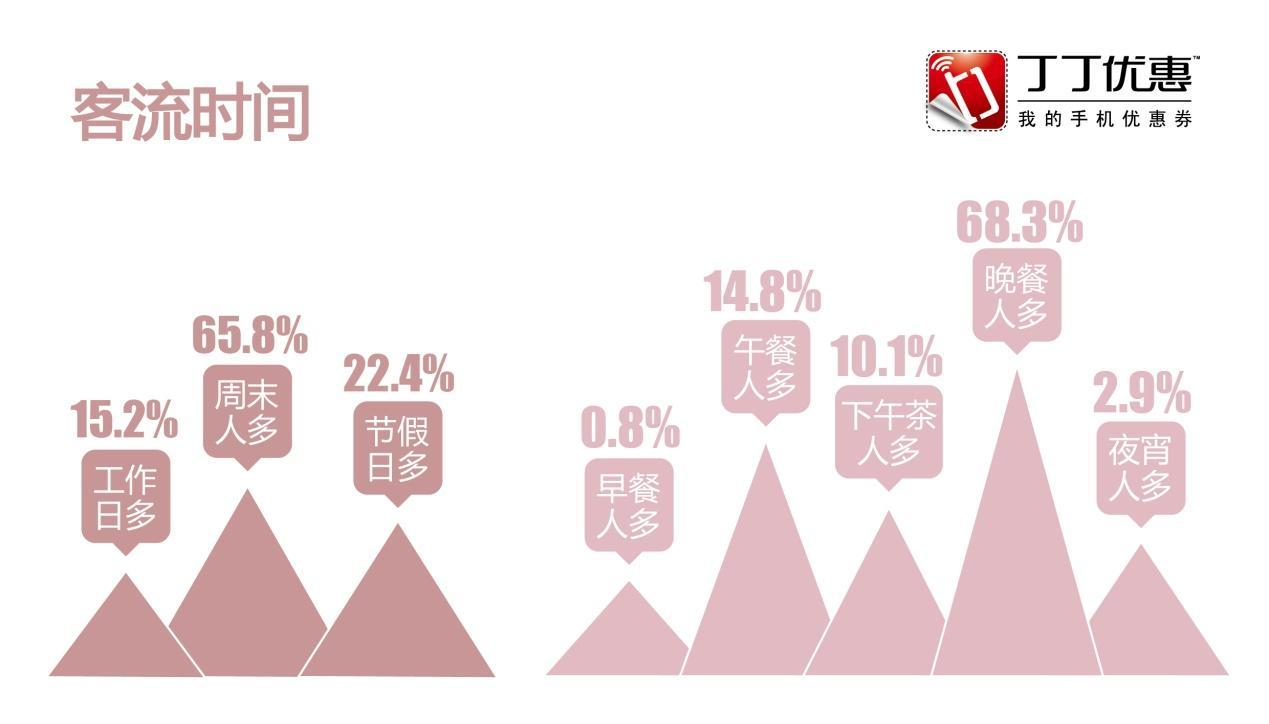 受都市白領(lǐng)休閑作息規(guī)律影響,餐飲店客流呈現(xiàn)日晚餐高峰和周六日節(jié)假日雙高峰表現(xiàn),其中60%以上客流來自于這兩個(gè)時(shí)段。調(diào)查也發(fā)現(xiàn),對(duì)于某些邊際市場(chǎng)的空間還有待挖掘,比如高新科技園區(qū)和工業(yè)園區(qū)甚至某些高密度寫字樓商圈,白領(lǐng)高密度聚集地需求量相應(yīng)旺盛,午餐雖單次消費(fèi)總額不高,但是勝在量大。