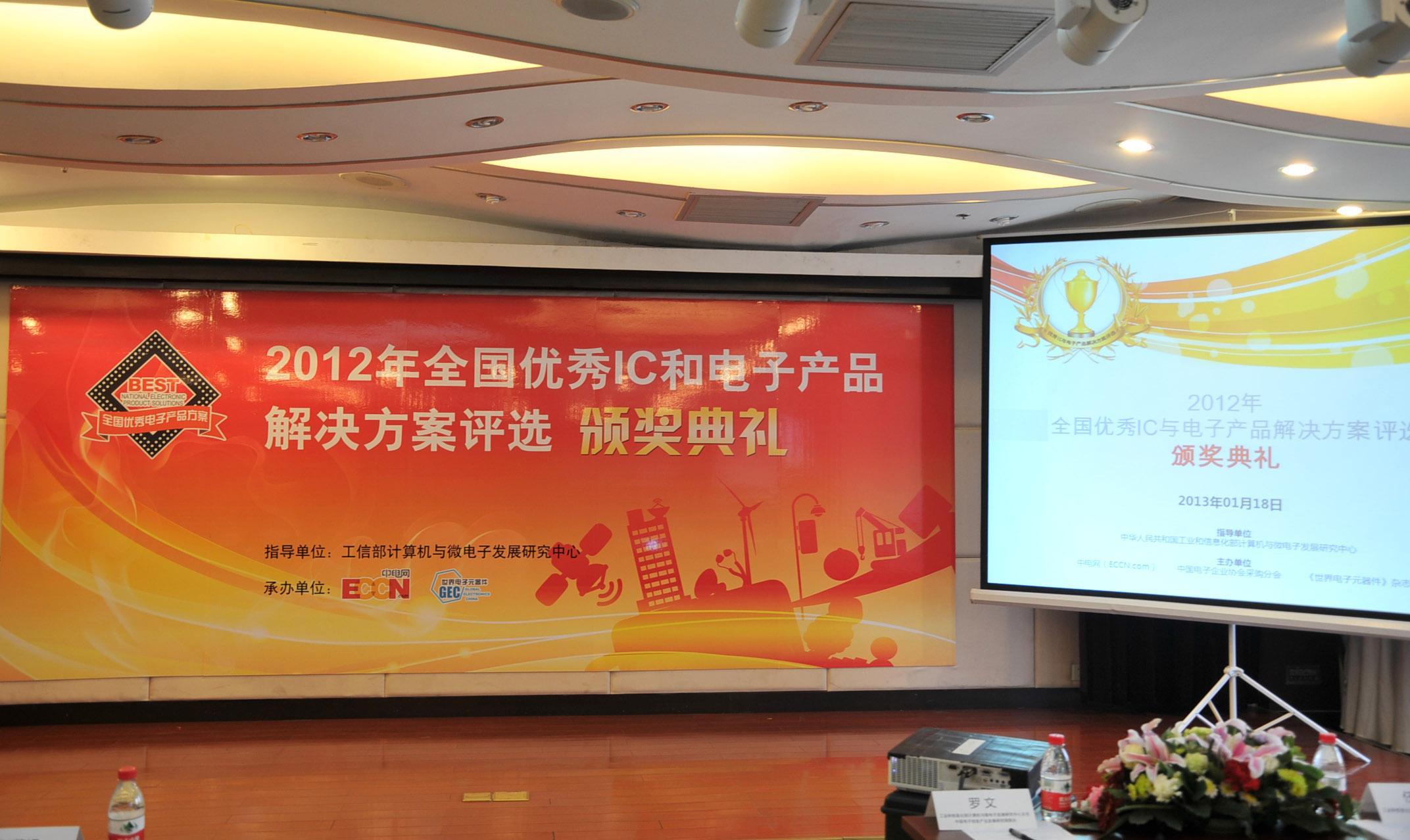 北京2013年1月22日電 /美通社/ -- 2013年1月18日,由工信部計(jì)算機(jī)與微電子發(fā)展研究中心指導(dǎo)、中電網(wǎng)(ECCN)與《世界電子元器件》雜志共同舉辦的“2012年全國優(yōu)秀 IC 和電子產(chǎn)品解決方案評選頒獎(jiǎng)大會”在工信部計(jì)算機(jī)與微電子發(fā)展研究中心會議室隆重舉行。本次評選共有來自30個(gè)國內(nèi)外廠商的39個(gè)解決方案獲獎(jiǎng),工信部計(jì)算機(jī)與微電子發(fā)展研究中心主任、中國電子信息產(chǎn)業(yè)發(fā)展研究院院長羅文、工信部集成電路處處長任愛光及中電網(wǎng)總裁兼 CEO 趙蔚揚(yáng)在會上發(fā)表了致辭和講話,并為獲獎(jiǎng)廠商頒獎(jiǎng)。