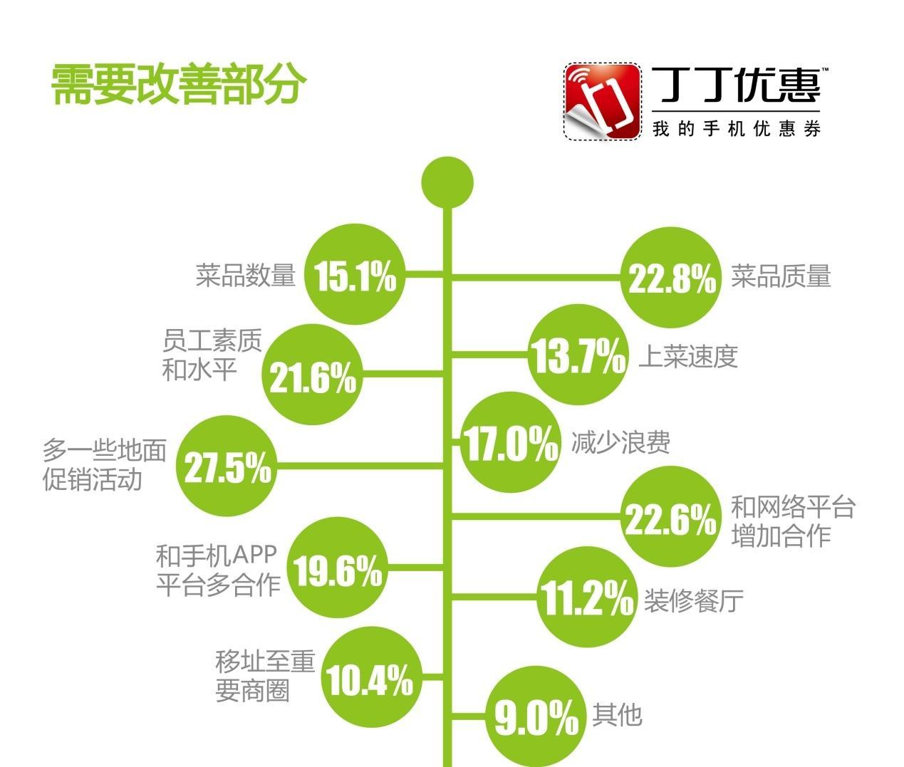 改革開放34年來,餐飲業(yè)經(jīng)歷了摸索、自發(fā)、無序、競爭發(fā)展,存在諸多發(fā)展中不可規(guī)避的問題,但是目前仍然是一批大型連鎖餐飲企業(yè)結(jié)合并借鑒國際化先進管理經(jīng)驗,帶領(lǐng)中國餐飲企業(yè)走向有序、多形態(tài)并存的餐飲生態(tài)圈,而這種以少數(shù)先進帶動大基數(shù)中小型餐飲企業(yè)有序競爭發(fā)展,需要餐飲行業(yè)協(xié)會及有關(guān)部門給予可持續(xù)的可操作性的指導(dǎo),需要強有力的導(dǎo)師團隊進行面對面的、點對點的服務(wù)指導(dǎo)。同時一批中間服務(wù)平臺也顯得尤為重要,比如丁丁優(yōu)惠這樣的手機 APP 平臺去幫助餐飲商戶營銷,解決商戶短板問題。當(dāng)然,餐飲業(yè)管理者自我提升更為關(guān)鍵。