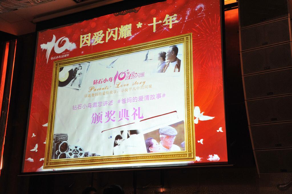 一位來自浙江紹興叫陸丹的女孩,在@鉆石小鳥上看見,鉆石小鳥征集“十年關(guān)于爸媽的愛情故事”,便將自己的父母的愛情故事以140字的微博參與了征集活動,最終在收集到的上千條愛情故事中,被ELLE、瑞麗、悅己等數(shù)家媒體作為具有代表性的平凡人的愛情故事挑選出來,這位女孩兒和她的父母都被特別邀請到鉆石小鳥品牌十周年的慶典現(xiàn)場。