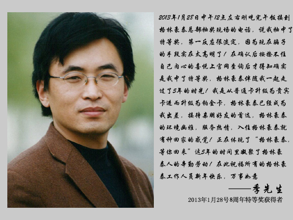 季先生是格林豪泰鉑金卡會(huì)員,從2008年開始就入住格林豪泰,也算是格林豪泰的一名老顧客?!耙话愠霾罨蛘哒写笥?、客人,都會(huì)選擇格林豪泰酒店,格林豪泰舒適、干凈的入住體驗(yàn),以及滿意周到的服務(wù)是我選擇格林豪泰的理由,很感謝格林豪泰舉辦這次活動(dòng)”!被問(wèn)及獲獎(jiǎng)感言時(shí),季先生響亮地喊出了格林豪泰的宣傳語(yǔ) -- “格林豪泰,等您回來(lái)”!