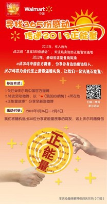 1月16日春節(jié)前夕,@沃爾瑪中國官方微博發(fā)起了“尋找365份感動,傳遞2013正能量”微公益活動,號召網(wǎng)友和顧客在新的一年中尋找、創(chuàng)造更多“感動”,發(fā)現(xiàn)更多社區(qū)好人。與此同時(shí),沃爾瑪員工志愿者也給那些正能量故事的主人公們以及那些需要幫助的人,比如無法回家過年的外來務(wù)工人員、“空巢老人”等,送上一份暖融融的心意。