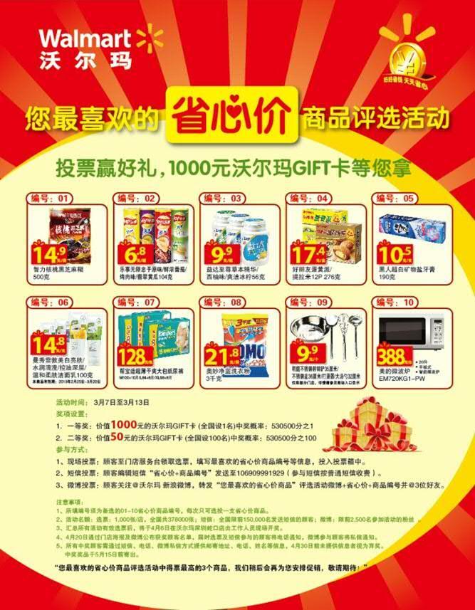 深圳2013年3月7日電 /美通社/ -- 繼去年11月,全國(guó)范圍的沃爾瑪購(gòu)物廣場(chǎng)及好又多門店推出“上千種省心價(jià)商品如您所需”的活動(dòng)后,3月7日起,沃爾瑪再次推出上千種“省心價(jià)”商品,包括食品、日用品、家庭用品等品類。同時(shí),3月7日至13日,沃爾瑪邀請(qǐng)顧客參與“您最喜歡的省心價(jià)商品評(píng)選活動(dòng)”,顧客通過(guò)在門店填寫選票、發(fā)送短信、轉(zhuǎn)發(fā)微博的方式,在10個(gè)備選商品中為自己心儀的“省心價(jià)”商品投上一票,就可參加幸運(yùn)抽獎(jiǎng),贏取面值1000元的沃爾瑪 GIFT 卡。獲得顧客投票數(shù)最多的前3名“省心價(jià)”商品,沃爾瑪還會(huì)為顧客提供后續(xù)的促銷。