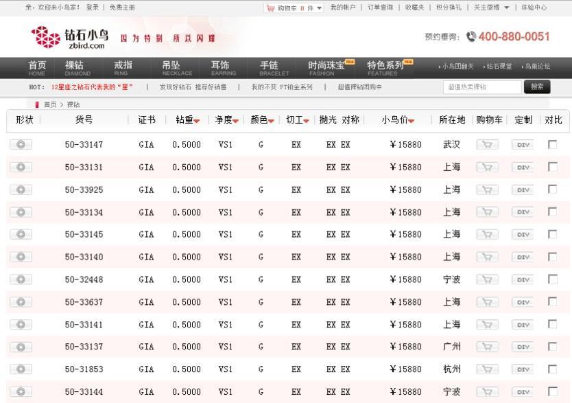 上海匯金百貨的一家珠寶品牌店的負(fù)責(zé)也印證這一說法,她舉了一個(gè)例子:一顆“50分的G色 VS1,3EX”的成品鉆石女戒,3年前,可以輕松賣到2.5萬左右,后來專柜品牌之間的競(jìng)爭加劇,也就不得不打折賣到2.2萬,即便是這樣還要經(jīng)受不住電商的沖擊,她就親自上鉆石小鳥的官網(wǎng)查詢過,同樣的一顆裸鉆,鉆石小鳥只賣1.6萬不到,記者通過查詢鉆石小鳥的官網(wǎng)印證了這一說法。