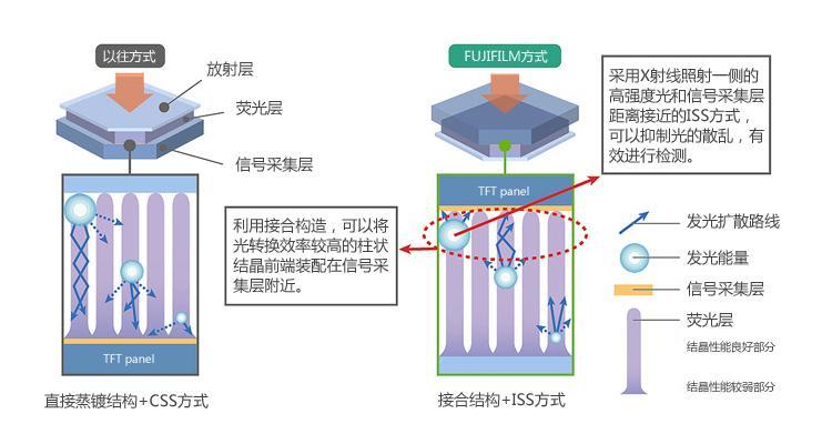 用于一般間接變化型FPD的CSS(Conventional Side Sampling,即傳統(tǒng)的透過側(cè)采集)方式中,X射線照射部位設(shè)置熒光層,發(fā)射部位設(shè)置信號(hào)采集層 (TFT panel)。CSS方式下,X射線發(fā)射部位發(fā)出的高強(qiáng)度光在到達(dá)信號(hào)采集層的過程中,容易發(fā)生衰減和散亂,使X射線信息損失較大。另一方面,在富士膠片獨(dú)有的“ISS技術(shù)”中,在X射線照射部位設(shè)置信號(hào)采集層,縮短了X射線在到達(dá)信號(hào)采集層之前經(jīng)過的的距離,從而可以有效接收X射線檢測出發(fā)出的光。此外,沒有采用將CsI柱狀結(jié)晶之直接蒸鍍于信號(hào)采集層,形成CsI柱狀結(jié)晶的一般“直接蒸鍍結(jié)構(gòu)”,而是采用了光轉(zhuǎn)換效率高,結(jié)晶性能優(yōu)越的CsI柱狀結(jié)晶先頭部分和信號(hào)采集層貼合的“接合結(jié)構(gòu)”,從而使高畫質(zhì)化成為可能。(請參考圖1)