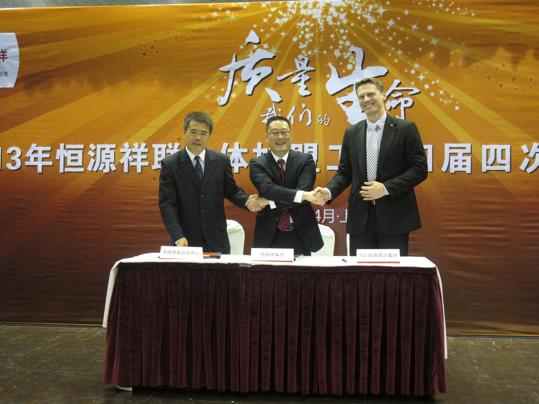 上海2013年4月24日電 /美通社/ -- 2013年4月6日,TUV 南德意志大中華集團(tuán) (以下簡(jiǎn)稱TUV SUD ),中國(guó)質(zhì)量認(rèn)證中心(以下簡(jiǎn)稱CQC)與恒源祥(集團(tuán))有限公司(以下簡(jiǎn)稱恒源祥)成功簽署了質(zhì)量管理體系審核戰(zhàn)略合作協(xié)議。合作三方將本著“戰(zhàn)略互利,合作共贏”的原則,在恒源祥集團(tuán)質(zhì)量管理體系審核等方面開展全面合作。TUV南德意志大中華集團(tuán)高級(jí)副總裁沃爾夫?qū)?. 徐貝爾(Mr. Wolfgang Hubl) 先生,中國(guó)質(zhì)量認(rèn)證中心李國(guó)振副主任,恒源祥總經(jīng)理陳忠偉先生以及副總經(jīng)理奚錫先生出席簽約儀式。
