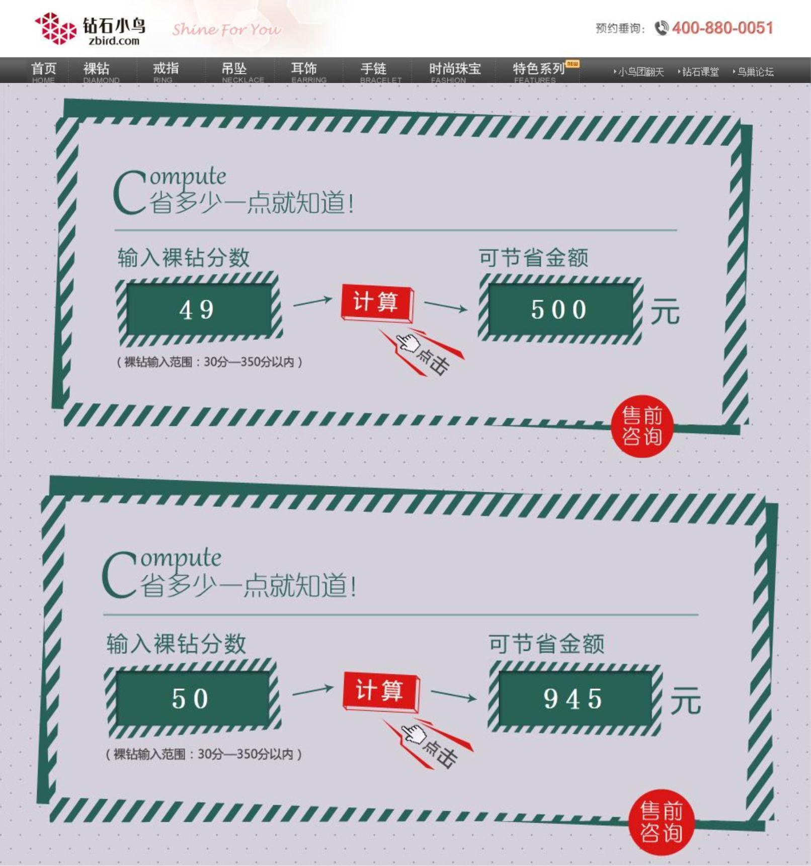 上海2013年4月24日電 /美通社/ -- 日前,在微博上,網(wǎng)友爆料珠寶品牌鉆石小鳥五一促銷活動規(guī)則有漏洞可鉆,通過鉆石小鳥官網(wǎng)(www.zbird.com )愛情公式計(jì)算,50分的裸鉆比49分的裸鉆優(yōu)惠額度更省一半。