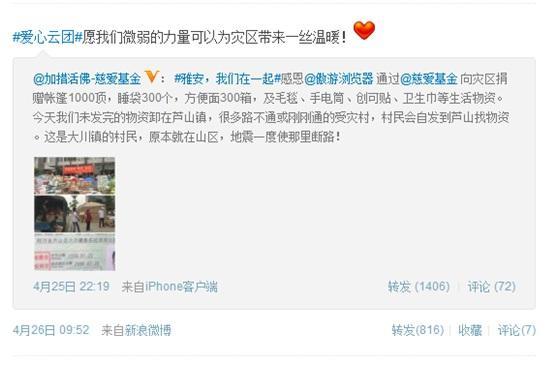 目前,傲游向四川災(zāi)區(qū)捐贈救災(zāi)物資的工作正在緊張開展。委托@加措活佛-慈愛基金 向災(zāi)區(qū)捐贈了帳篷1000頂,睡袋300個,方便面300箱,創(chuàng)可貼300包,以及若干毯子、雨衣、女性用品、手電筒、幼兒用品等災(zāi)區(qū)急需物資。并且在物資采購到位后,傲游還派出一名專業(yè)的傲游志愿者深入災(zāi)區(qū),協(xié)助基金會進(jìn)行救助活動,一同保障物資能以較快速度送達(dá)災(zāi)區(qū)。在災(zāi)難面前,傲游用切實的行動展現(xiàn)了互聯(lián)網(wǎng)企業(yè)在危難時刻的擔(dān)當(dāng)。
