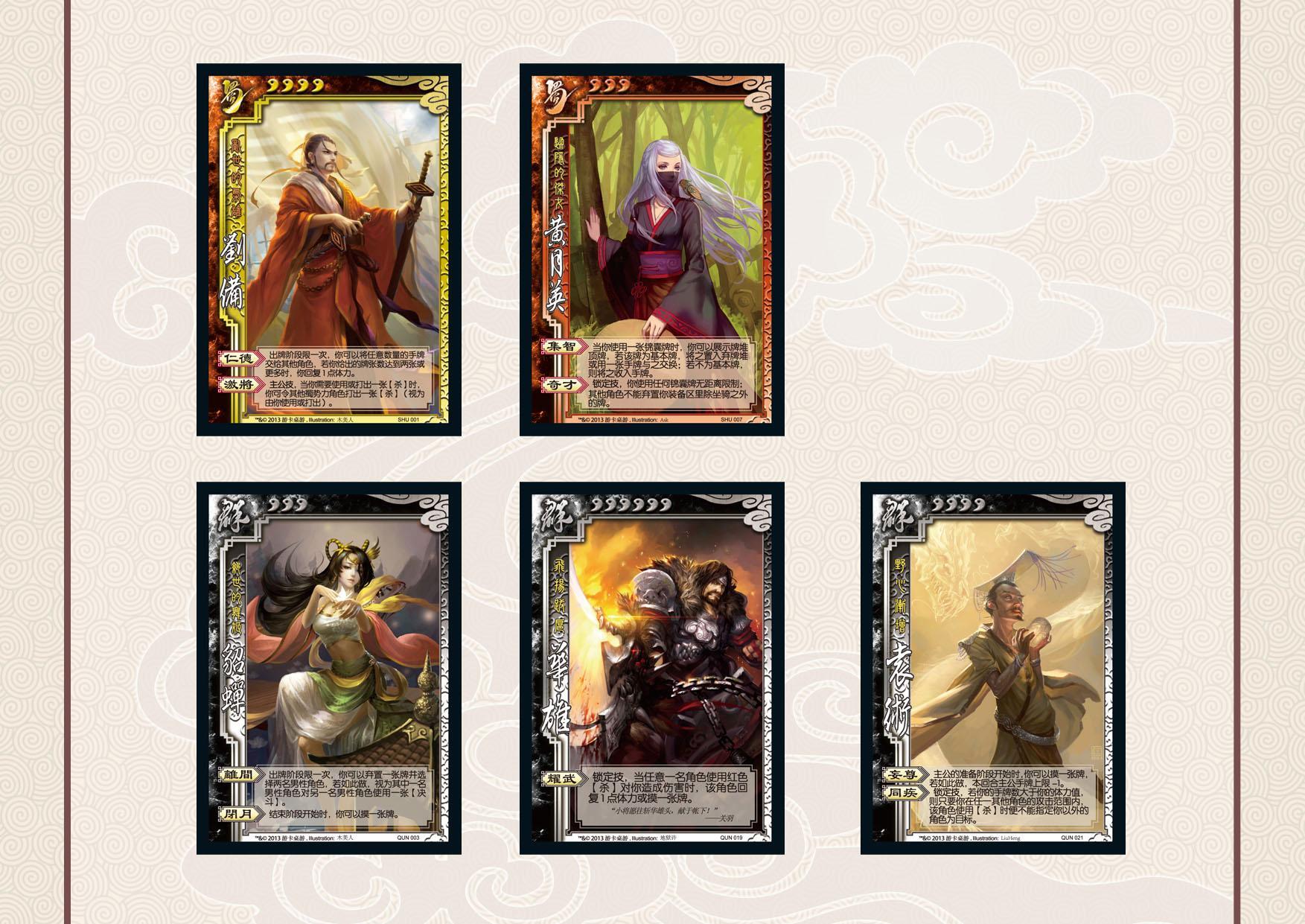 北京2013年5月20日電 /美通社/ -- 5月20日,游卡桌游重量級(jí)產(chǎn)品《三國(guó)殺 2013 標(biāo)準(zhǔn)版》正式發(fā)售,本次改版官方積極匯總玩家提出的建設(shè)性意見(jiàn),同時(shí)依據(jù)《三國(guó)殺Online》和線下測(cè)試的結(jié)果,重新制定了劉備、貂蟬、黃月英等武將的技能,并加入了華雄、袁術(shù)兩名新武將,使《三國(guó)殺》的競(jìng)技性和娛樂(lè)性達(dá)到了一個(gè)新的高度。五名新武將均以全新形象登場(chǎng),下面讓我們先睹為快。