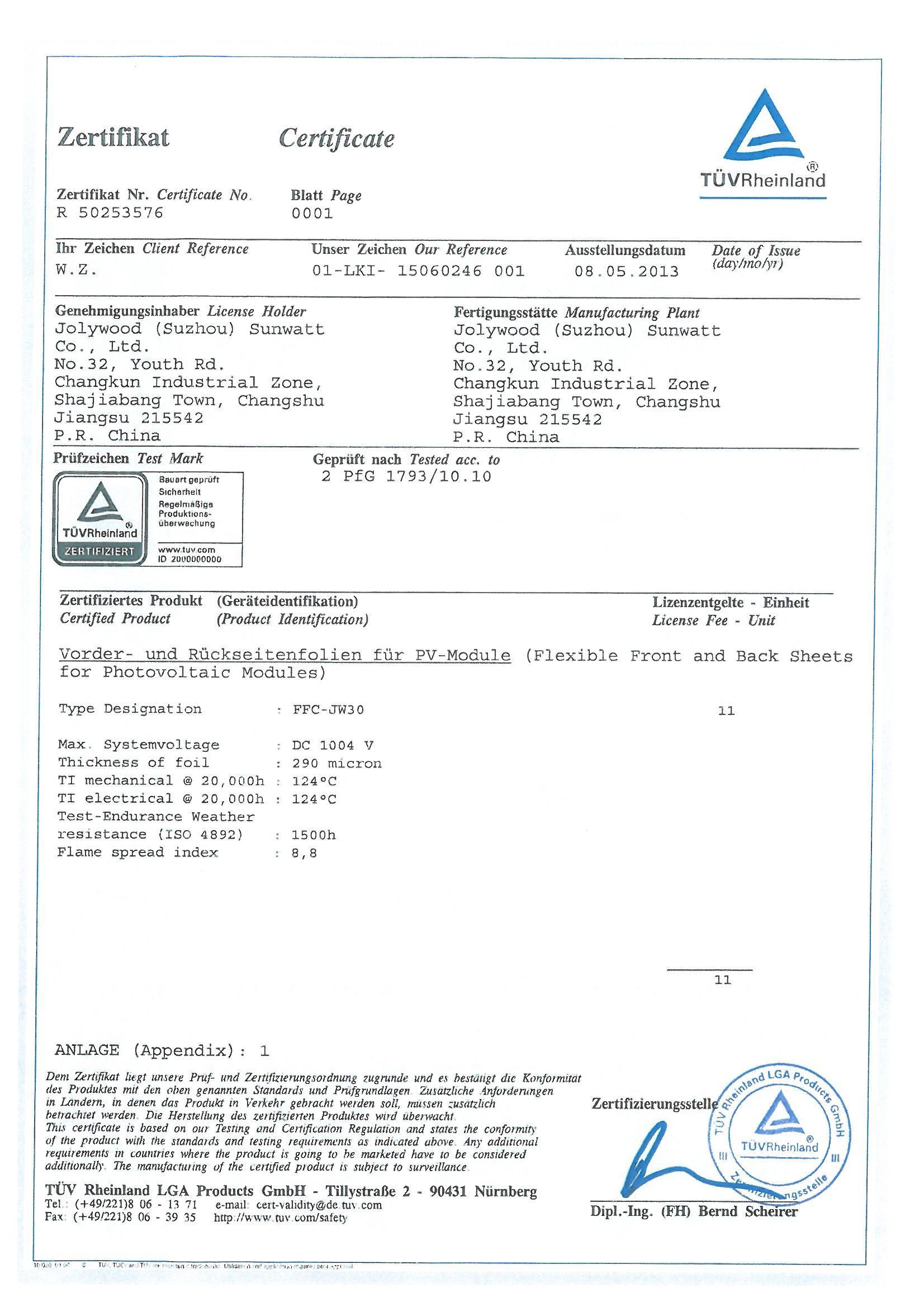 德國萊茵TUV頒發(fā)大中華區(qū)首張?zhí)柲鼙嘲遄C書,填補了太陽能背板長期以來產(chǎn)品認證的空白。長期以來,廣大組件廠商只有依靠局部放電報告來對太陽能背板進行要求和選擇,這樣無疑在材料特性以及老化特性(尤其長期相對熱指數(shù)和光老化)等方面留下了極大的隱患。在沒有相關(guān)國際標準的前提下,德國萊茵TUV根據(jù)太陽能光伏產(chǎn)品特性,基于2PfG1793/10.10的標準對太陽能背板提出了新的要求,以保障其安全性。測試條目包括背板的機械性能、材料熱特性、化學特性等,同時也包括了對材料相對熱指數(shù)(RTI)、火焰?zhèn)鞑ブ笖?shù),電性能(局部放電測試)等的測試。