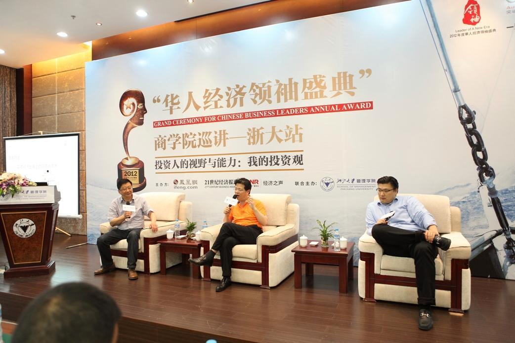 緊接著,主辦方領導鳳凰網副總裁兼總編輯劉書在致辭中表示:自2009年,鳳凰網以‘中華情懷,全球視野,兼容開放,進步力量’理念,攜手《21世紀經濟報道》、中央人民廣播電臺經濟之聲在全球華人范圍內評選10位影響中國乃至世界發(fā)展的年度經濟領袖人物,至今已經是第五個年頭了。帶著媒體的使命,及組委會的責任,我們舉辦了一系列的商學院巡講活動,邀請商界領袖與青年精英現(xiàn)場交流,互動觀點。今天商學院巡講是第一次走入浙江,走進浙大,此次商學院巡講走入浙大管理學院,能夠為商界領袖與名校學子搭建交流平臺,互動觀點,是一件非常有意義的事。