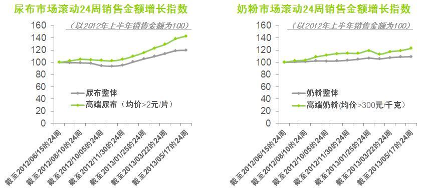 Kantar Worldpanel嬰兒樣組的監(jiān)測(cè)還顯示,高端的尿片產(chǎn)品在2013年1-5月銷(xiāo)售金額同比去年增長(zhǎng)46%;而嬰幼兒奶粉市場(chǎng)中,雖然高端奶粉滲透率增長(zhǎng)已經(jīng)放緩,但是消費(fèi)者對(duì)高端奶粉仍然趨之若鶩,高端奶粉產(chǎn)品在今年1-5月的銷(xiāo)售額同比增長(zhǎng)25%。同時(shí),一個(gè)有趣的市場(chǎng)現(xiàn)象是,無(wú)論高端奶粉還是高端尿片,在中低收入家庭中滲透率增長(zhǎng)在過(guò)去一年要快于高收入家庭,在省會(huì)級(jí)城市的滲透率增速也超過(guò)了重點(diǎn)城市(北京、上海、廣州、成都),這說(shuō)明高端的嬰兒產(chǎn)品正在逐步滲入到各類(lèi)家庭和城市級(jí)別中去, 這對(duì)于生產(chǎn)商和零售商來(lái)說(shuō)都意味著巨大的產(chǎn)品升級(jí)的商機(jī)。