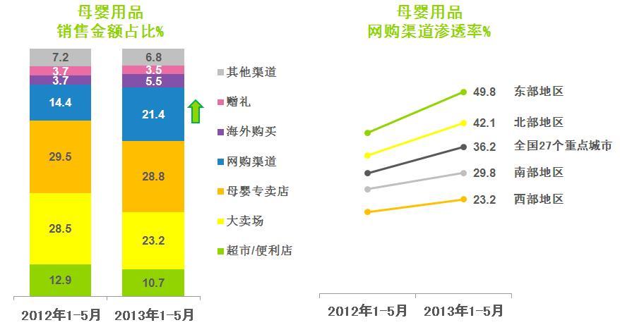 Kantar Worldpanel嬰兒樣組數(shù)據(jù)顯示,在重點(diǎn)及省會(huì)城市中整體母嬰用品網(wǎng)購(gòu)滲透率在今年1-5月中已經(jīng)高達(dá)36.2%,而整體非食品快消品類(lèi)的網(wǎng)購(gòu)滲透率卻只有16.3%。其中網(wǎng)購(gòu)滲透率增長(zhǎng)較快的是以北京、上海為代表的北部與東部地區(qū):滲透率分別達(dá)到了49.8%和42.1%。這意味著如果廠商要接觸到更多的消費(fèi)者,就必須加強(qiáng)自己品牌在電子商務(wù)渠道的推廣。通過(guò)和不同電商平臺(tái)的合作,企業(yè)能讓自己的產(chǎn)品獲得更加廣泛的成長(zhǎng)機(jī)會(huì)。