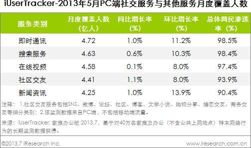 2013年5月社區(qū)交友類服務(wù)網(wǎng)民滲透率超過90%,平穩(wěn)增長
