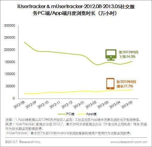 社交類服務(wù)流量在PC端和App端表現(xiàn)各異,移動端流量增長迅速。2013年5月與2012年8月相比,App端月度瀏覽時(shí)長上升77.7%,PC端則下降34.3%,App端流量增長明顯。艾瑞分析認(rèn)為,社區(qū)交友類服務(wù)在移動端發(fā)展更加強(qiáng)勁,社交類App對用戶時(shí)間的分流日漸明顯。