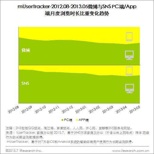 2013年5月,微信與新浪微博在App端月度瀏覽時(shí)長排名靠前,優(yōu)勢突出