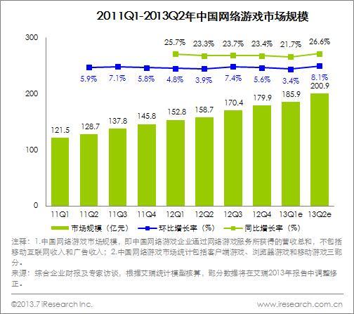 北京2013年8月7日電 /美通社/ -- 艾瑞咨詢分析師嚴華雯認為,2013Q2中國網絡游戲市場超過200億元,環(huán)比增長8.1%,同比增長26.6%。移動游戲成為2013年行業(yè)熱點。