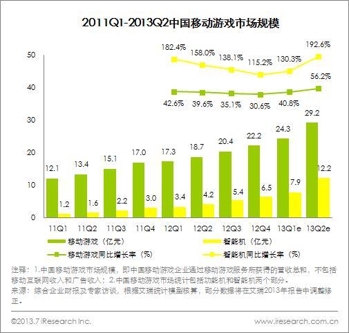 總結:2013Q2網絡游戲依托移動游戲和網頁游戲的快速擴張,市場規(guī)模不斷增加,尤其今年是移動游戲如火如荼來勢洶洶的一年。