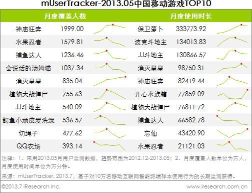 艾瑞根據mUserTracker數據整理發(fā)現(xiàn),TOP10榜單中,以《神廟狂奔》、《水果忍者》、《保衛(wèi)蘿卜》等輕游戲產品的用戶人數和時長較高,游戲門檻低,操控性更適宜移動終端小屏幕。而其他如《JJ斗地主》、《QQ農場》等游戲,憑借線下及PC端游戲的延續(xù)性,同樣獲得了移動游戲用戶的青睞??傮w而言,休閑性的游戲更容易獲得移動用戶接受。