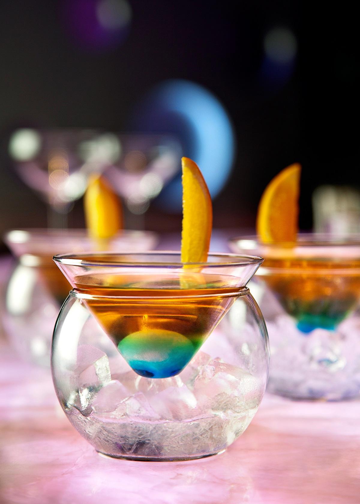 麗笙托帕雞尾酒的創(chuàng)作靈感則來自黃玉,它不僅色澤綺麗、引人遐思,而且價值不菲。這款雞尾酒由無酒精的藍(lán)橙 (Blue Curacao)、純糖漿、鮮榨青檸汁和薄荷葉調(diào)配而成,配上糖球一起飲用。