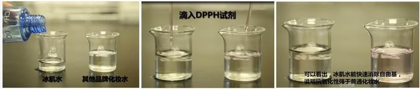 分別在冰肌水和其他品牌化妝水中滴入DPPH試劑(DPPH是一種穩(wěn)定的自由基,常用于抗氧化實驗),約幾分鐘后,冰肌水(左側(cè))與自由基融合消除,試劑顏色恢復(fù)透明。由此可見,冰肌水的抗氧功力確實很強大。
