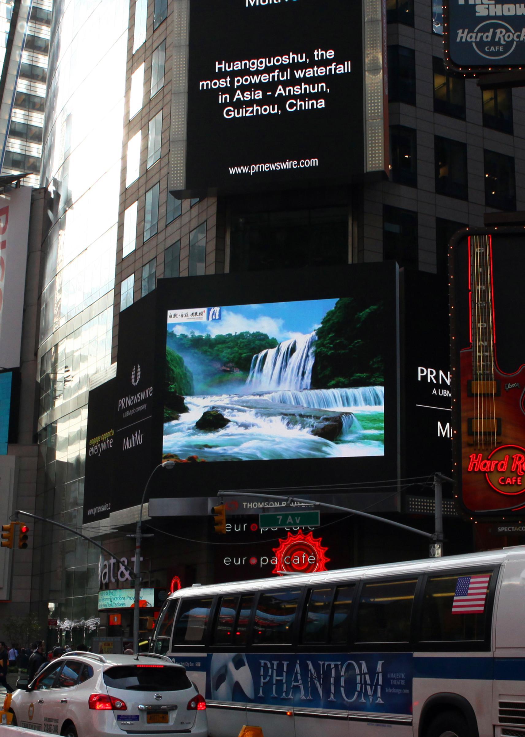 中國(guó)安順2013年10月17日電 /美通社/ -- 2013年10月14日,紐約時(shí)代廣場(chǎng)大屏刊登了1幅黃果樹(shù)瀑布?jí)邀惥坝^的圖片,以《黃果樹(shù),亞洲壯觀的瀑布》為題對(duì)黃果樹(shù)景區(qū)進(jìn)行了報(bào)道,這是貴州省景區(qū)在海外推廣中首次成功登陸紐約時(shí)代廣場(chǎng)。