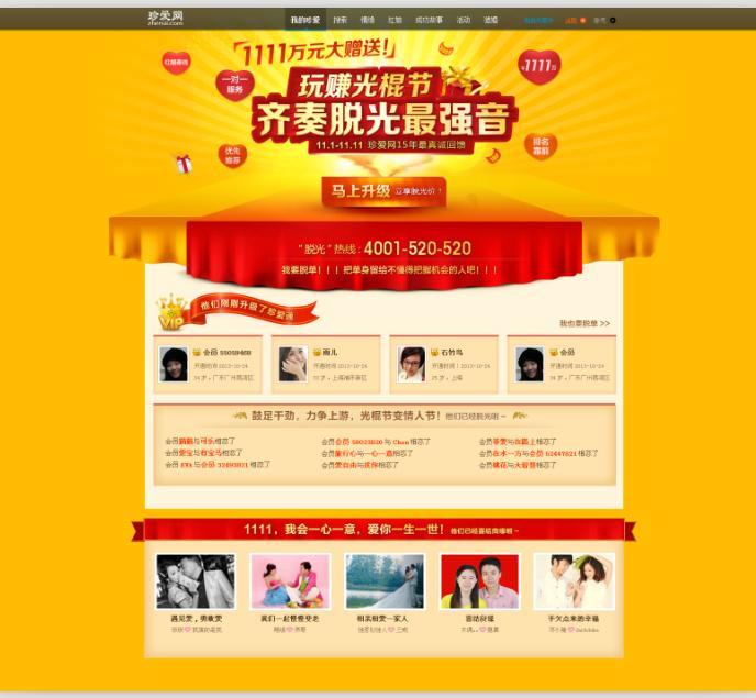 吃喝玩樂之余別忘了脫光這件人生大事!活動期間珍愛網(wǎng)線上全線網(wǎng)站產(chǎn)品均有大優(yōu)惠,每天完成指定任務(wù)參與抽獎定將提高脫光幾率,珍愛通VIP會員更有前所未有的特大回饋,1111萬人工紅娘大回饋誠意陪伴你光棍節(jié)不孤單!