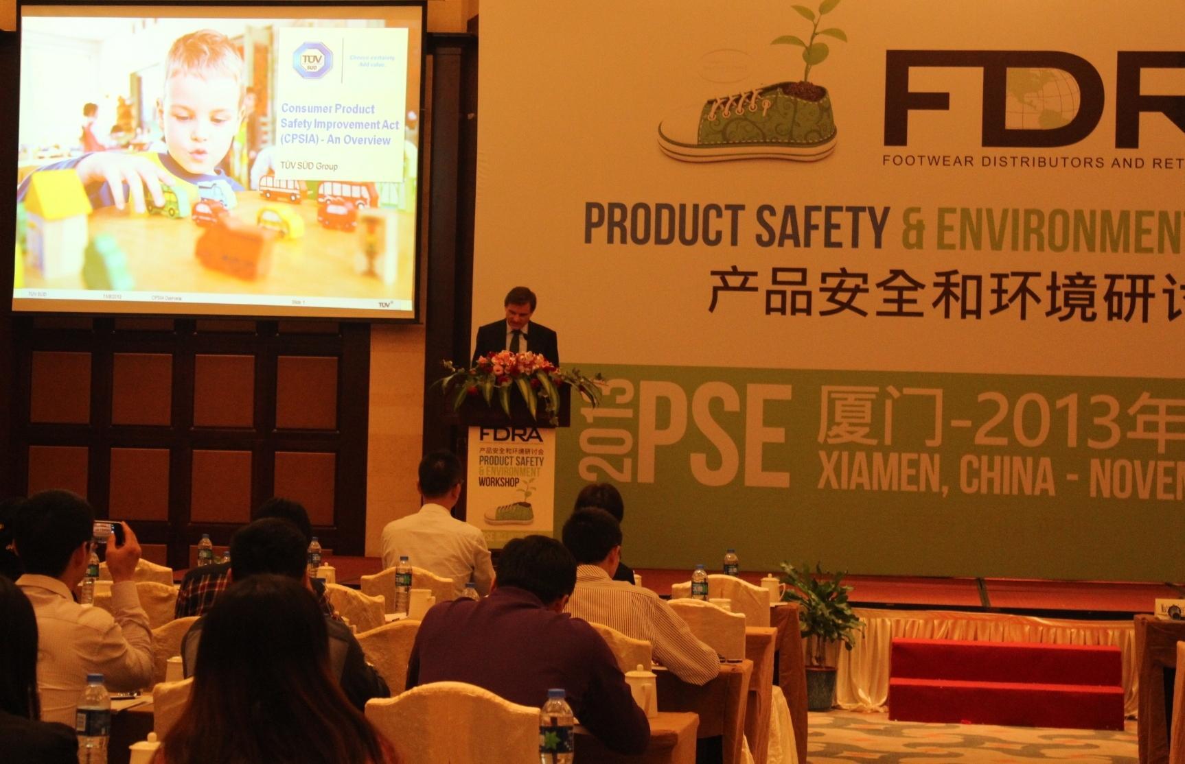 廈門(mén)2013年11月8日電 /美通社/ -- TUV南德意志集團(tuán)(以下簡(jiǎn)稱(chēng) TUV SUD)聯(lián)合美國(guó)規(guī)模較大的鞋業(yè)行業(yè)協(xié)會(huì) -- Footwear Distributors and Retailers of America (以下簡(jiǎn)稱(chēng) FDRA) 在廈門(mén)共同舉辦 FDRA 產(chǎn)品安全與環(huán)境研討會(huì) (PSE),本次研討會(huì)旨在向鞋業(yè)工廠管理層、采購(gòu)、質(zhì)控、產(chǎn)品研發(fā)部門(mén)人員,以及企業(yè)高層提供所需信息,以確保生產(chǎn)與材料的安全與可持續(xù)性。TUV SUD 大中華集團(tuán)總裁兼首席執(zhí)行官范華德(Dirk von Wahl)出席此次研討會(huì)并致辭。TUV SUD 大中華集團(tuán)紡織品部總監(jiān)雷家文博士,以及 TUV SUD 化學(xué)資深專(zhuān)家趙健先生和王慧女士,共同在現(xiàn)場(chǎng)與眾多企業(yè)代表一同分享鞋業(yè)產(chǎn)品安全的最新發(fā)展與較佳實(shí)踐。