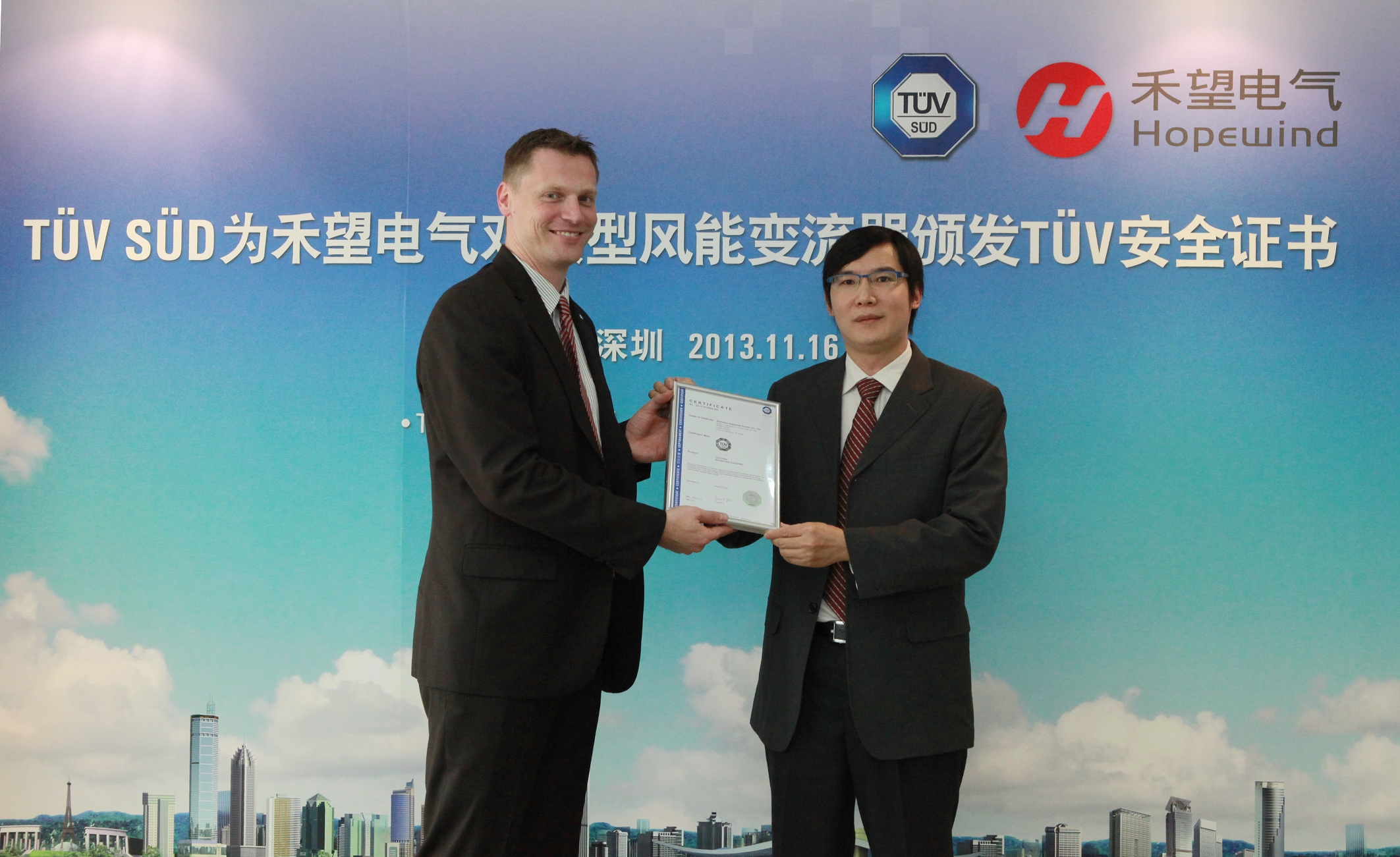 深圳2013年11月18日電 /美通社/ -- 2013年11月14日,TUV南德意志集團(以下簡稱TUV SUD)為深圳市禾望電氣有限公司(以下簡稱禾望電氣)旗下雙饋型風電變流器頒發(fā)了TUV SUD安全認證證書,TUV SUD大中華區(qū)高級副總裁Wolfgang Hubl先生、禾望電氣研發(fā)中心總監(jiān)周黨生先生出席了頒證儀式。