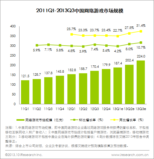 北京2013年11月19日電 /美通社/ -- 2013Q3網(wǎng)絡游戲市場規(guī)模達到224.0億元,同比增長41.4%、環(huán)比增長10.7%;移動游戲市場規(guī)模達35.7億元,同比增長75%。