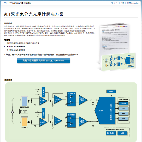 上海2013年11月20日電 /美通社/ -- Analog Devices, Inc.(NASDAQ: ADI),全球領(lǐng)先的高性能信號處理解決方案供應(yīng)商,近日推出了一款雙光束分光光度計解決方案。作為ADI當月精選方案,這款光度計憑借低功耗、高精度和極度可靠的穩(wěn)定性,可廣泛適用于科研和工業(yè)領(lǐng)域,為工程師解決該類設(shè)計難題提供了簡單高效的解決方案。