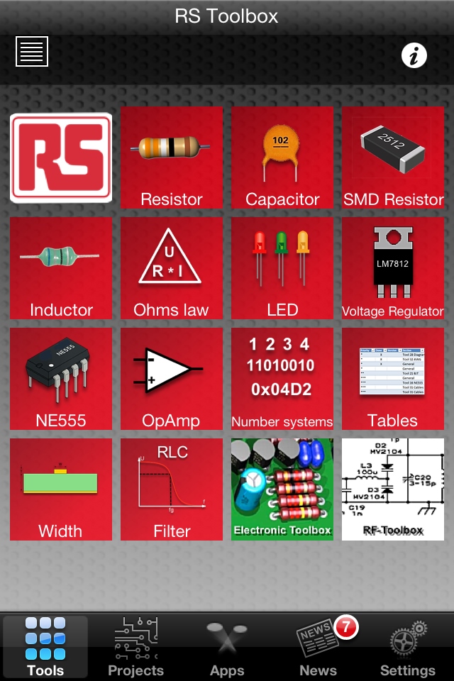 RS Toolbox 提供一系列廣泛的功能,均以圖標(biāo)形式在主屏幕上分組呈現(xiàn),包括多種工程計算器、轉(zhuǎn)換器和查詢表。例如RLC濾波計算器,555定時配置器,用于各種穩(wěn)壓器和運(yùn)算放大器的計算器,以及諸如編號系統(tǒng)轉(zhuǎn)換器和歐姆定律計算器等基本工具,還有包括電池類型與尺寸、電纜顏色編碼、封裝尺寸和螺線管規(guī)格等內(nèi)容的查詢表。