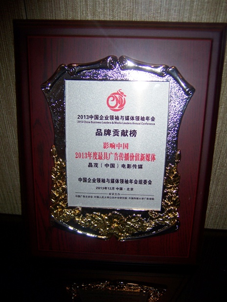 北京2013年12月17日電 /美通社/ -- 以“傳播正能量,共筑中國夢”為主題,備受國內(nèi)企業(yè)界、傳媒界、廣告界、藝術(shù)界關(guān)注的“2013中國企業(yè)領(lǐng)袖與媒體領(lǐng)袖年會”暨“品牌貢獻(xiàn)榜年度盛典”,近日在北京金隅喜來登酒店盛大舉行。晶茂(中國)電影傳媒喜獲品牌貢獻(xiàn)榜“2013年度最具廣告?zhèn)鞑r(jià)值新媒體”大獎。